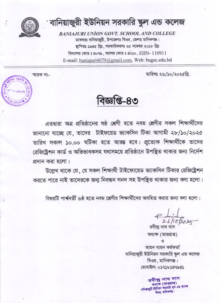 টাইফয়েড ভ্যাকসিন টিকা বিজ্ঞপ্তি-৪৩